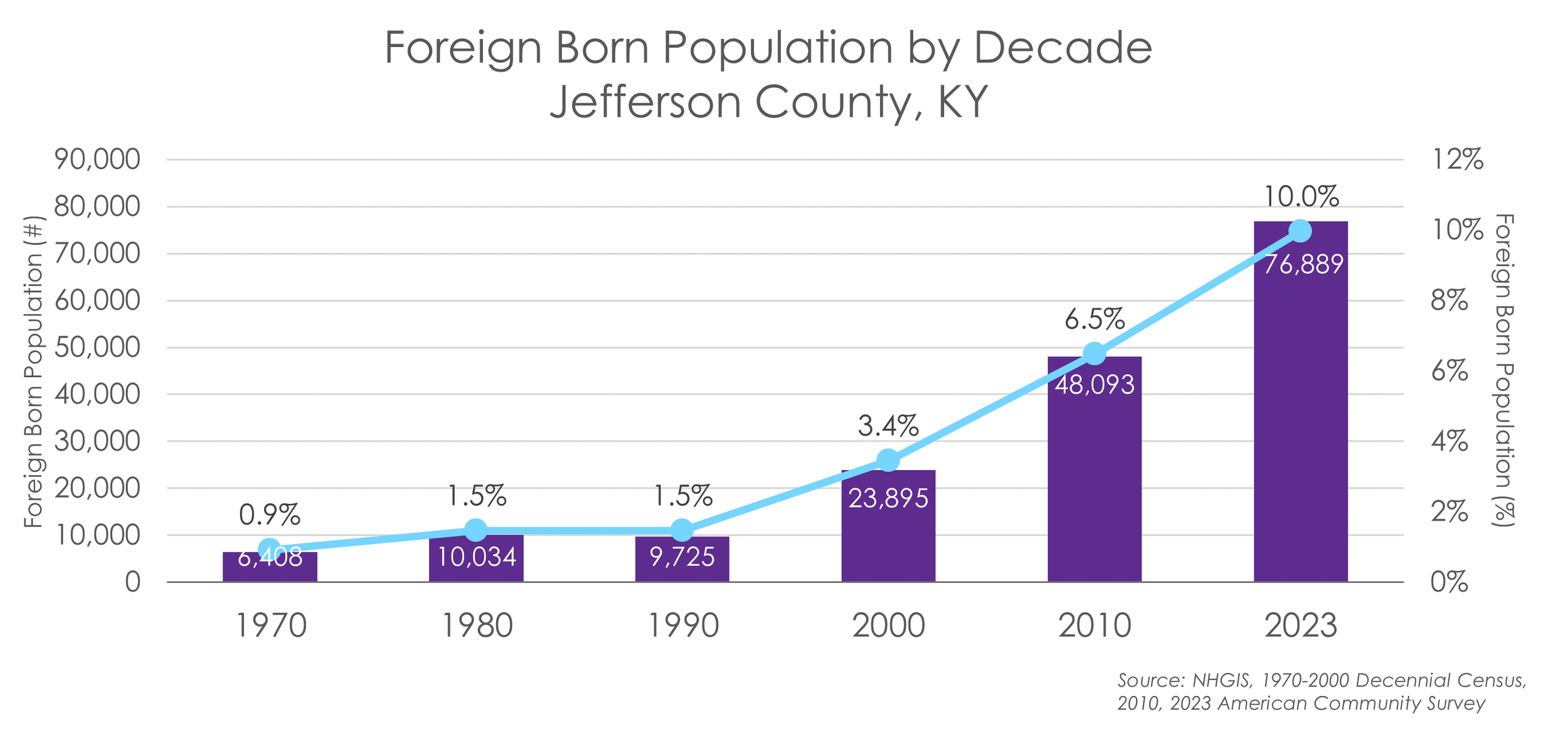 The Louisville region’s population is 10% foreign born (NHGIS, 1970-2000 Decennial Census, 2010, 2023 American Community Survey). According to the National Fund for Workforce Solutions, the United States is undergoing an unprecedented generational change. During this demographic shift, we will see over 73 million individuals reach retirement age by 2030. This will have an enormous impact on the available workforce in our country. Simultaneously, the most diverse generations of young adults ever will enter the workforce. Nationally, 48% of Gen Z are People of Color (POC), 25% are Hispanic, and 14% areBlack). Locally, 37.5% of Gen Z are People of Color (POC), 11.5% are Hispanic, and are 18% Black**. The call from employers for an equipped labor force will be answered by a young, multi-racial, multi-ethnic, multi-generational workforce.