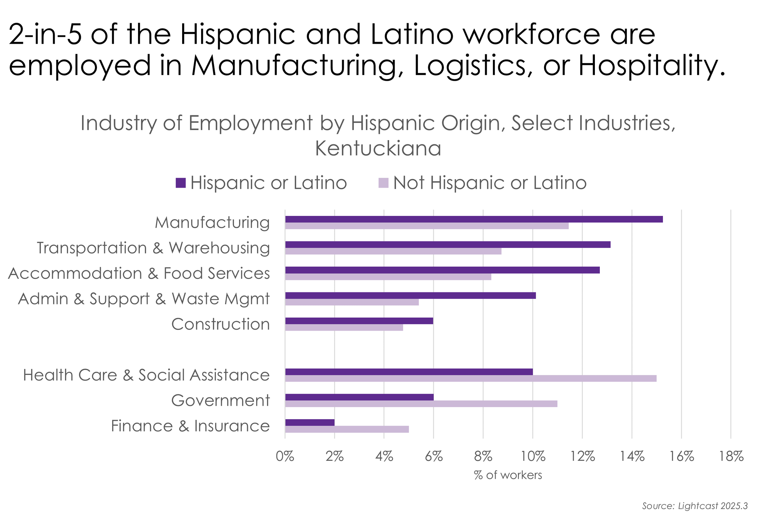 There are more than 44,000 Hispanic and Latino workers across Kentuckiana, and they are critical to some of the region’s key sectors. They are overrepresented in industries including manufacturing, logistics, and hospitality. 2-in-5 of the Hispanic workforce is employed in one of these three industries. However, they are underrepresented in healthcare and the public sector.