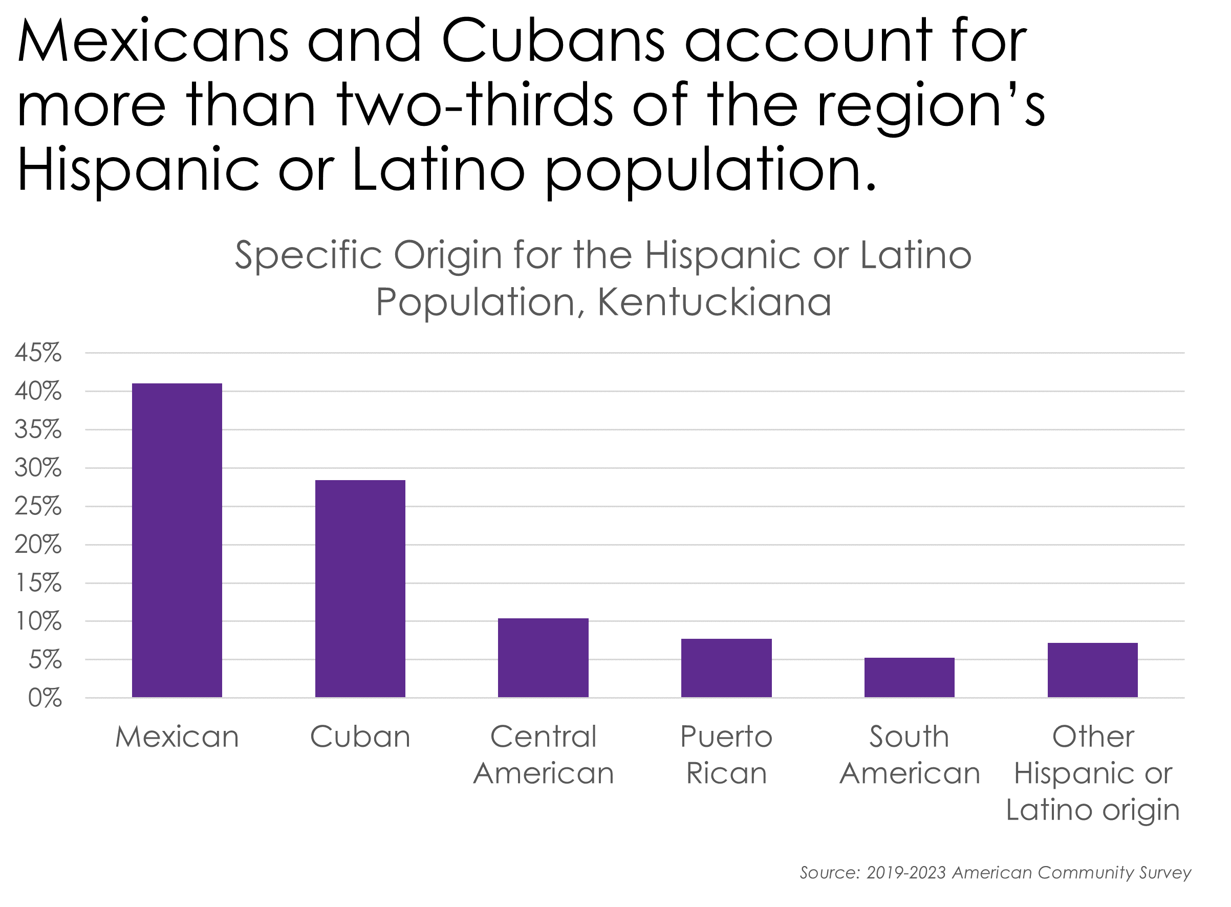 The region’s Hispanic and Latino population traces their heritage to more than 25 different countries. Mexicans and Cubans account for more than two-thirds of the region’s Hispanic and Latino population. 10% of the region’s Hispanic and Latino population trace their origins to one of the seven Central American countries, led by representation from Guatemala. South Americans comprise 5% of the region’s Hispanic and Latino population, led by representation from Colombia and Peru.