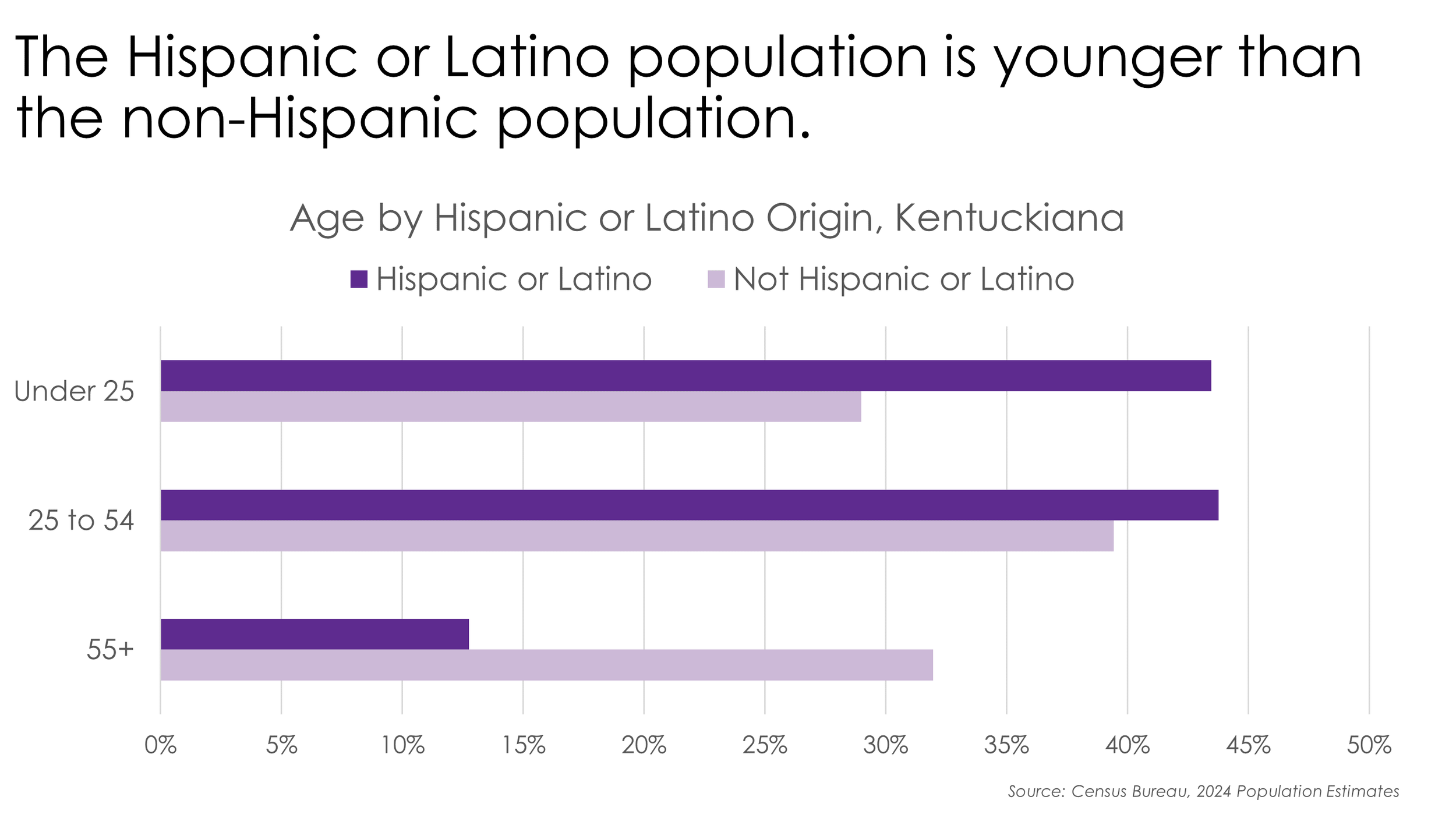 Kentuckiana’s Hispanic and Latino population are key to the region’s future, as they are much younger than the non-Hispanic population. Just 13% of the region’s Hispanic population are ages 55 and older, while nearly a third of the non-Hispanic population is. An aging population is expected to contribute to a tight labor market for years to come.