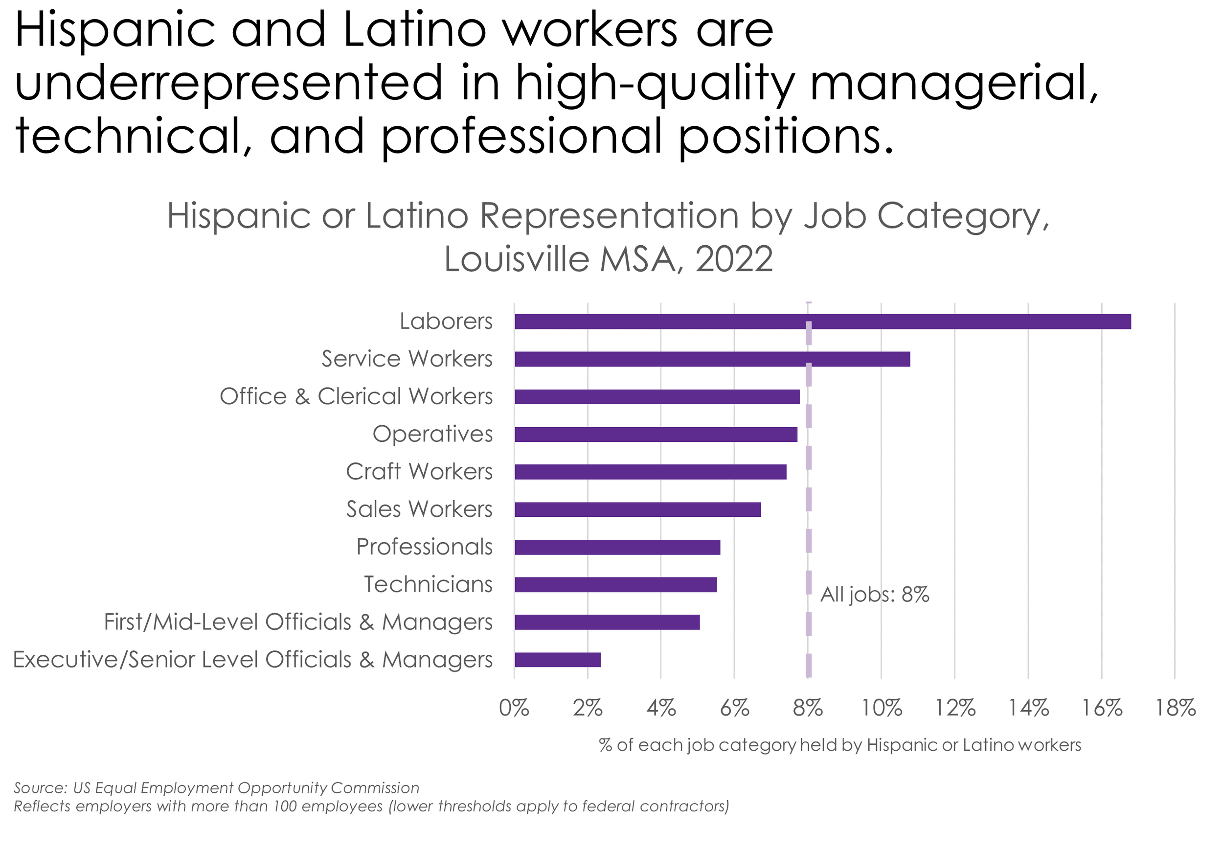 The roles held by Hispanic and Latino workers are often in low-quality jobs. As is the case for other workers of color, data from the Equal Employment Opportunity Commission shows how the region’s Hispanic workers are underrepresented in high-quality managerial, technical, and professional positions, and overrepresented in low-quality laborer and service positions.