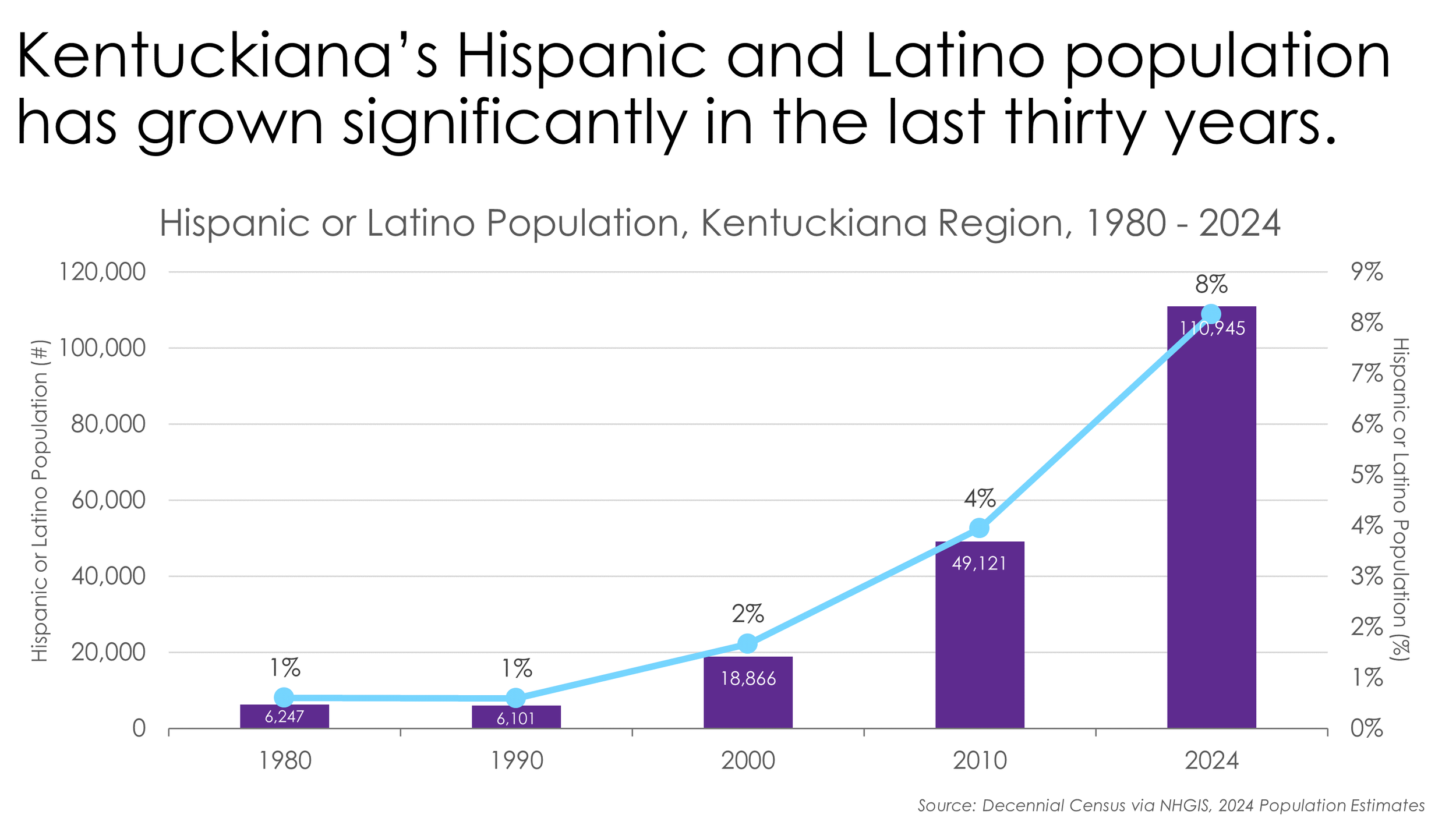 The Kentuckiana region is home to nearly 111,000 people who identify as Hispanic or Latino. Accounting for 8% of the population in 2024, the Hispanic population has grown exponentially in the last thirty years.