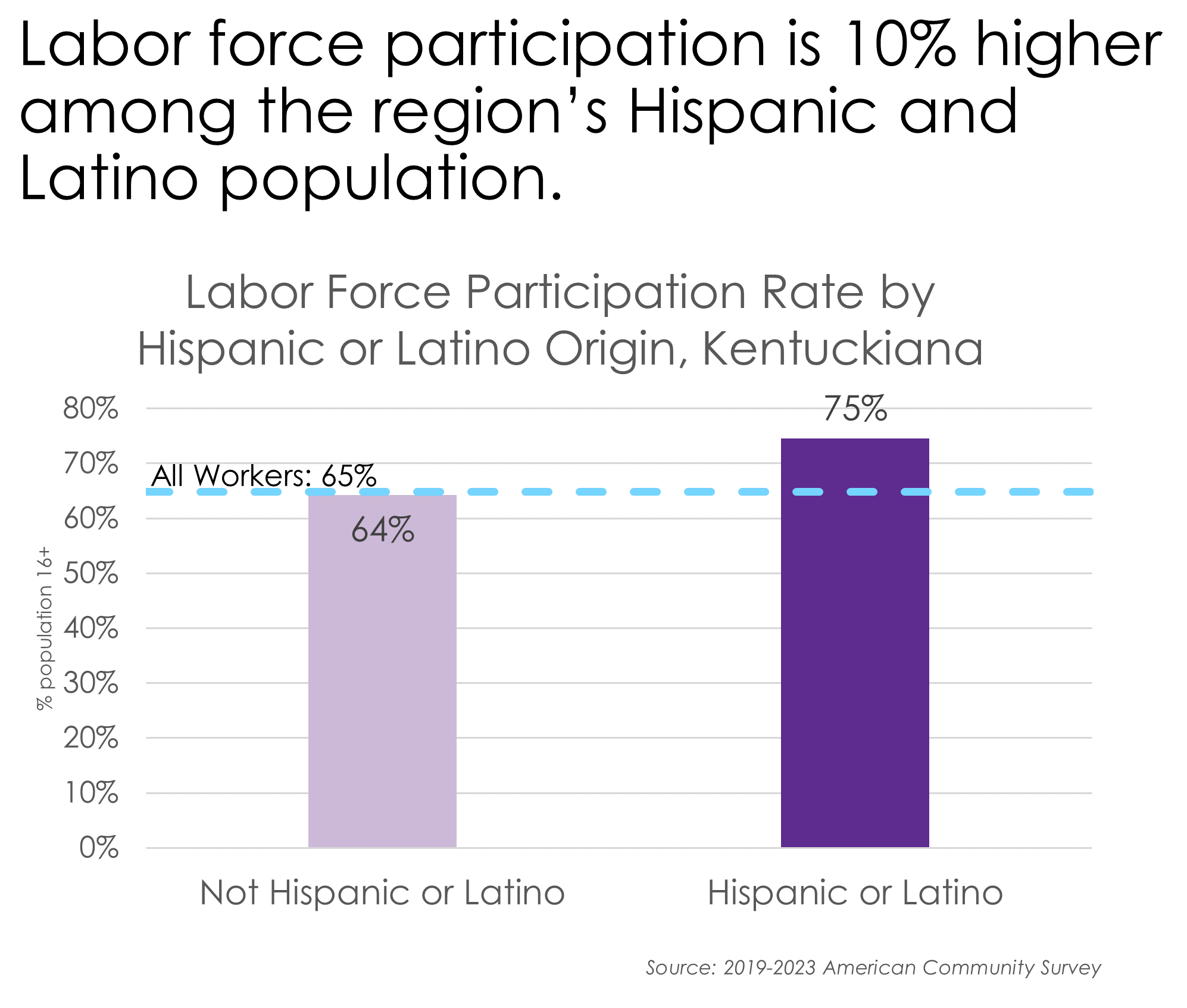 Kentuckiana’s Hispanic and Latino population are also key to the region’s current workforce. The labor force participation rate among the region’s Hispanic and Latino population is 10 percentage points higher than labor force participation among the region’s non-Hispanic population. This is at least partially attributable to the age distribution of the population.