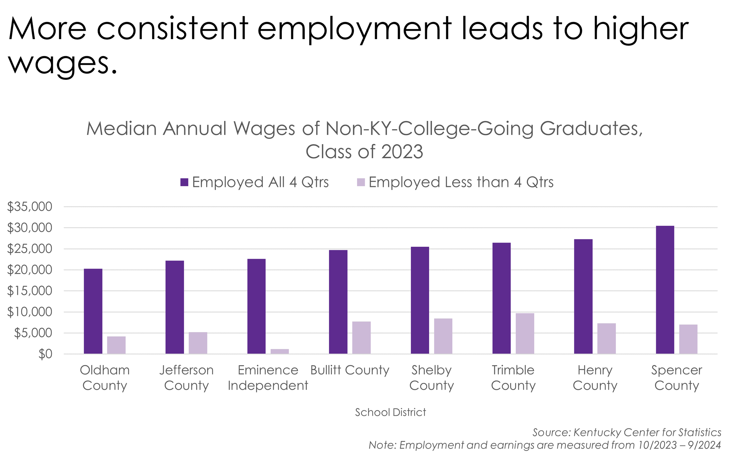 The administrative records used to track employment do not include information about the number of hours worked each quarter, only that there were positive earnings in that quarter. The percentage of graduates who worked four consecutive quarters the year following high school graduation shows a measure of consistency of employment. While the total hours worked each quarter are still unknown, it shows persistent employment over the year. Among those graduates who did not enroll in postsecondary but did work the year after graduation, 60% were employed for all four quarters, nearly 2,400 young workers. This ranges from 68% among Bullitt County Public School graduates, to 53% among Trimble County Public School graduates. There were 1,600 young workers who worked at least one quarter the year after high school graduation, but fewer than four.