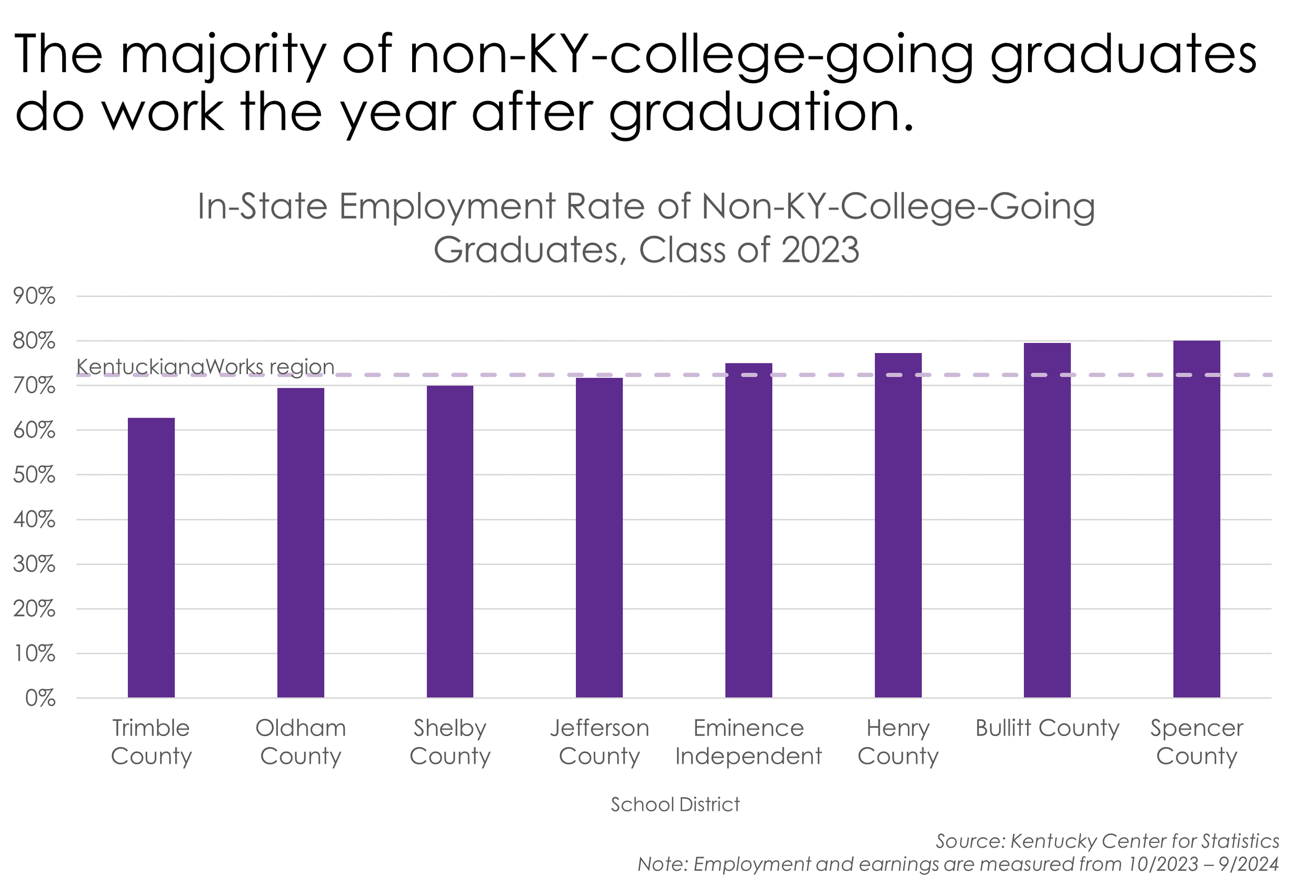 Among the class of 2023 who did not enroll in an in-state postsecondary institution the year after graduation, 72%, nearly 4,000 young people, worked at least part of the year for a Kentucky employer the year after graduation. Graduates from Spencer County Public Schools and Bullitt County Public Schools had the highest in-state employment rates, where 80% of the graduates who did not enroll in college worked the year after graduation.