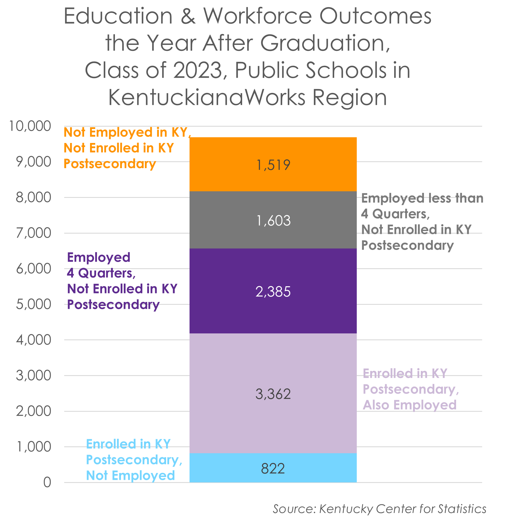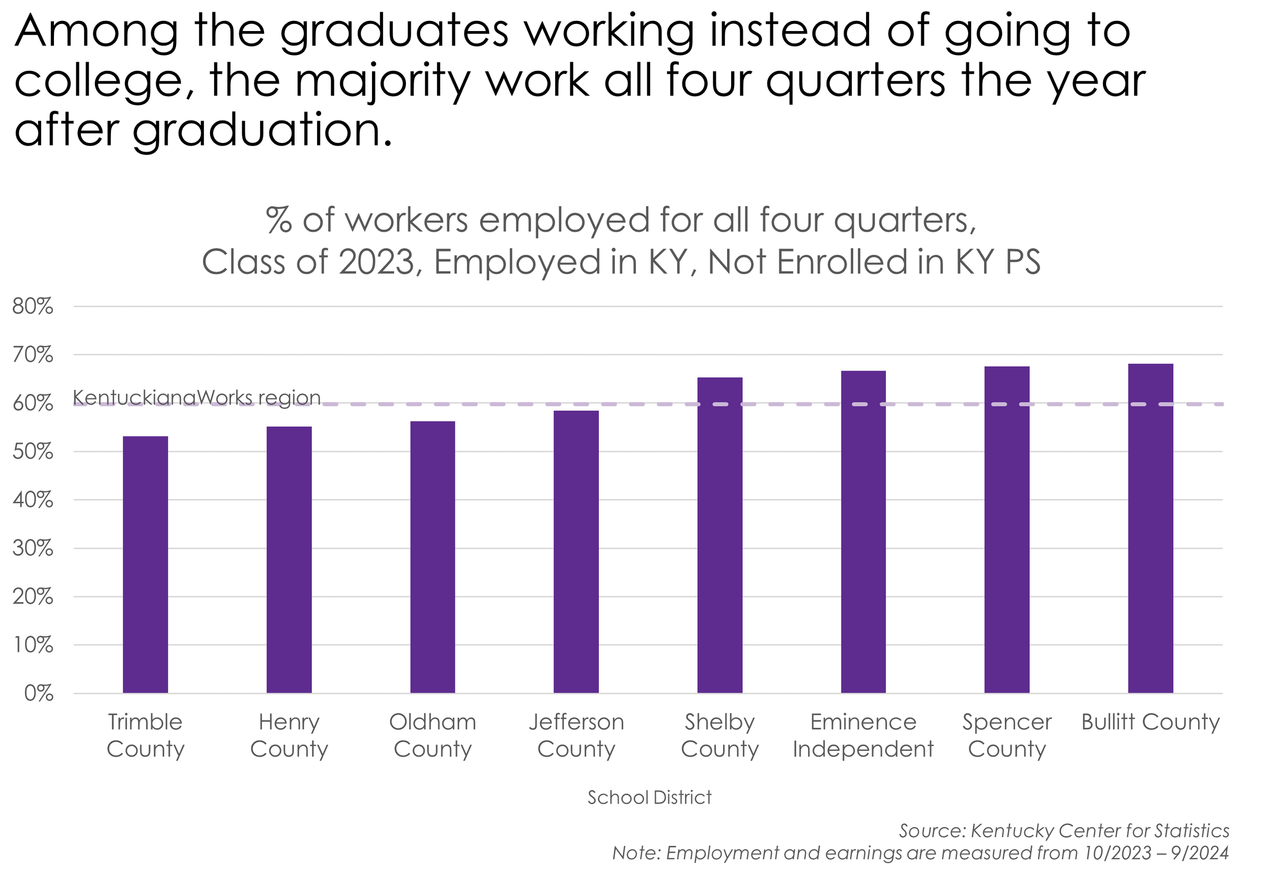 This analysis was completed by the Kentucky Center for Statistics, part of the Kentucky Education & Labor Cabinet. It looks at high school graduates from public schools in the KentuckianaWorks region, which covers Bullitt, Henry, Jefferson, Oldham, Shelby, Spencer, and Trimble counties. Enrollment in postsecondary is measured by enrollment in a Kentucky postsecondary institution within a year after graduating high school. It does not capture postsecondary enrollment in out-of-state institutions. Employment is measured as W-2 employment in Kentucky. It does not capture out-of-state employment, 1099 employment, gig work, cash-paid work, or unpaid work. Employment is measured as positive earnings in at least one quarter the federal fiscal year after graduation, October 1, 2023 - September 30, 2024.
