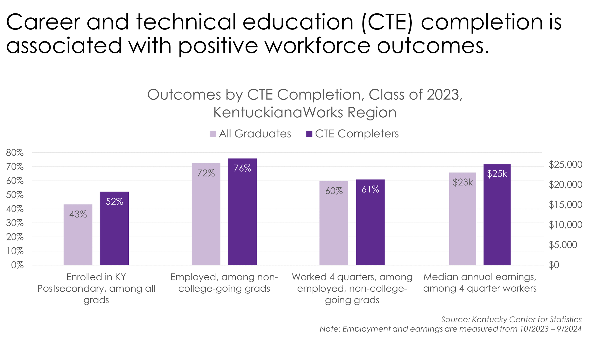 Across the public school districts in the KentuckianaWorks region, 30% of the graduating class of 2023 were CTE completers, nearly 3,000 students. CTE completers have higher rates of postsecondary enrollment, higher rates of non-college-goers working, and among those working, they are more likely to be working all four quarters, resulting in higher median annual earnings.