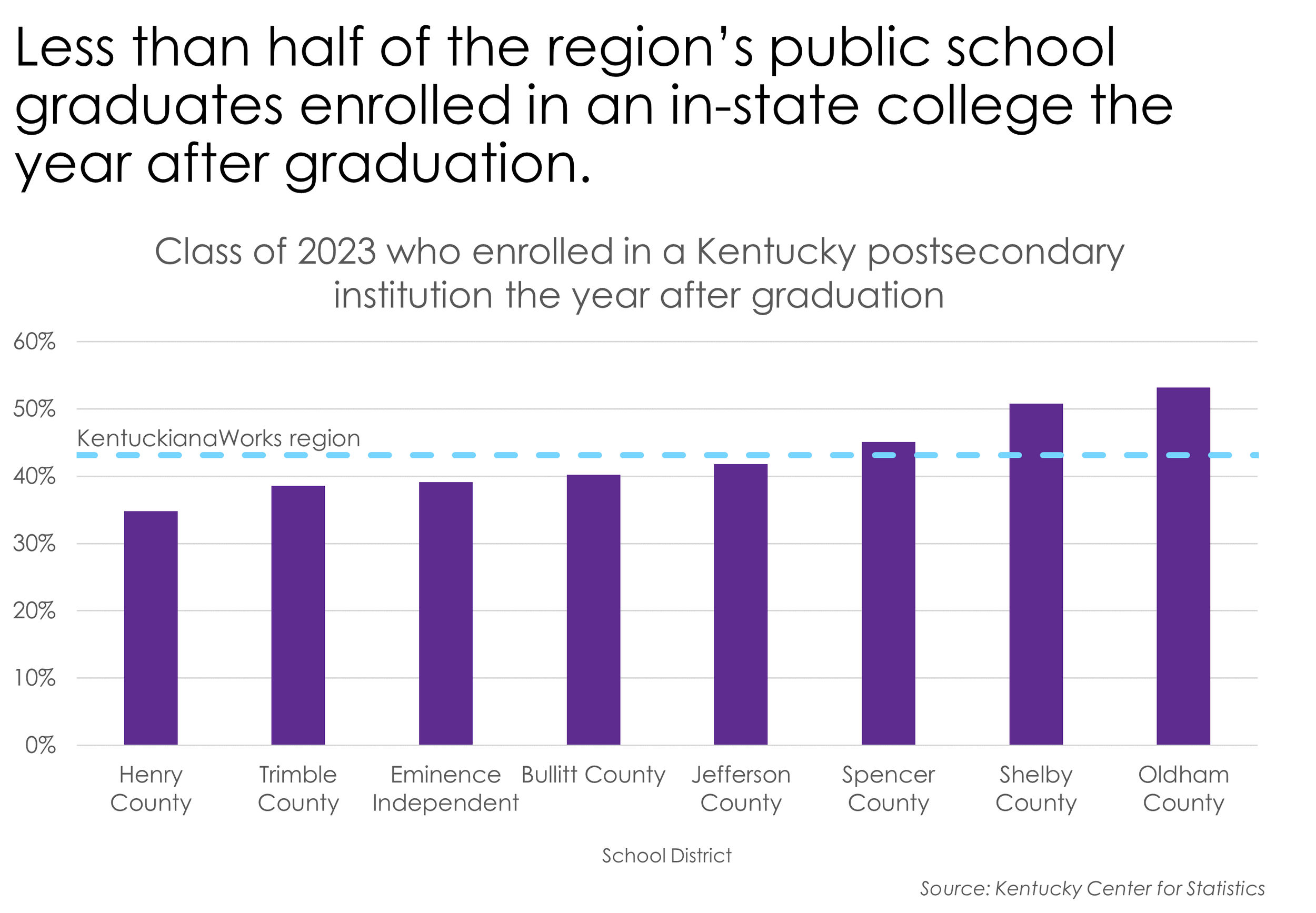 There were nearly 9,700 high school graduates from the class of 2023 across the public school districts in the KentuckianaWorks region (Bullitt, Henry, Oldham, Jefferson, Shelby, Spencer, and Trimble counties). Overall, 43% of graduates enrolled in a Kentucky postsecondary institution the year after graduation. Among these 4,200 postsecondary-enrolled students, 80% also worked the year after high school graduation.