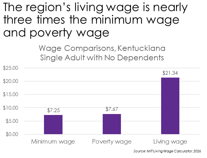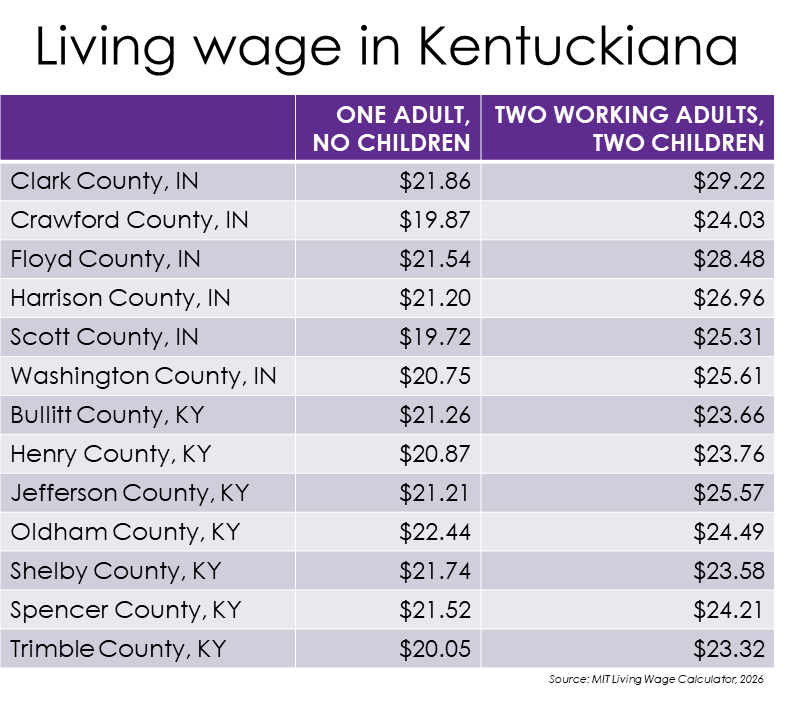 The Living Wage Calculator, developed by economists at MIT, crunches the data on modern-day expenses to estimate how much workers need to earn to meet their basic needs in the community in which they live and their household size. The latest version of the data was recently released, reporting that workers across the Louisville region need to earn at least $21 per hour to cover the costs of their basic needs.